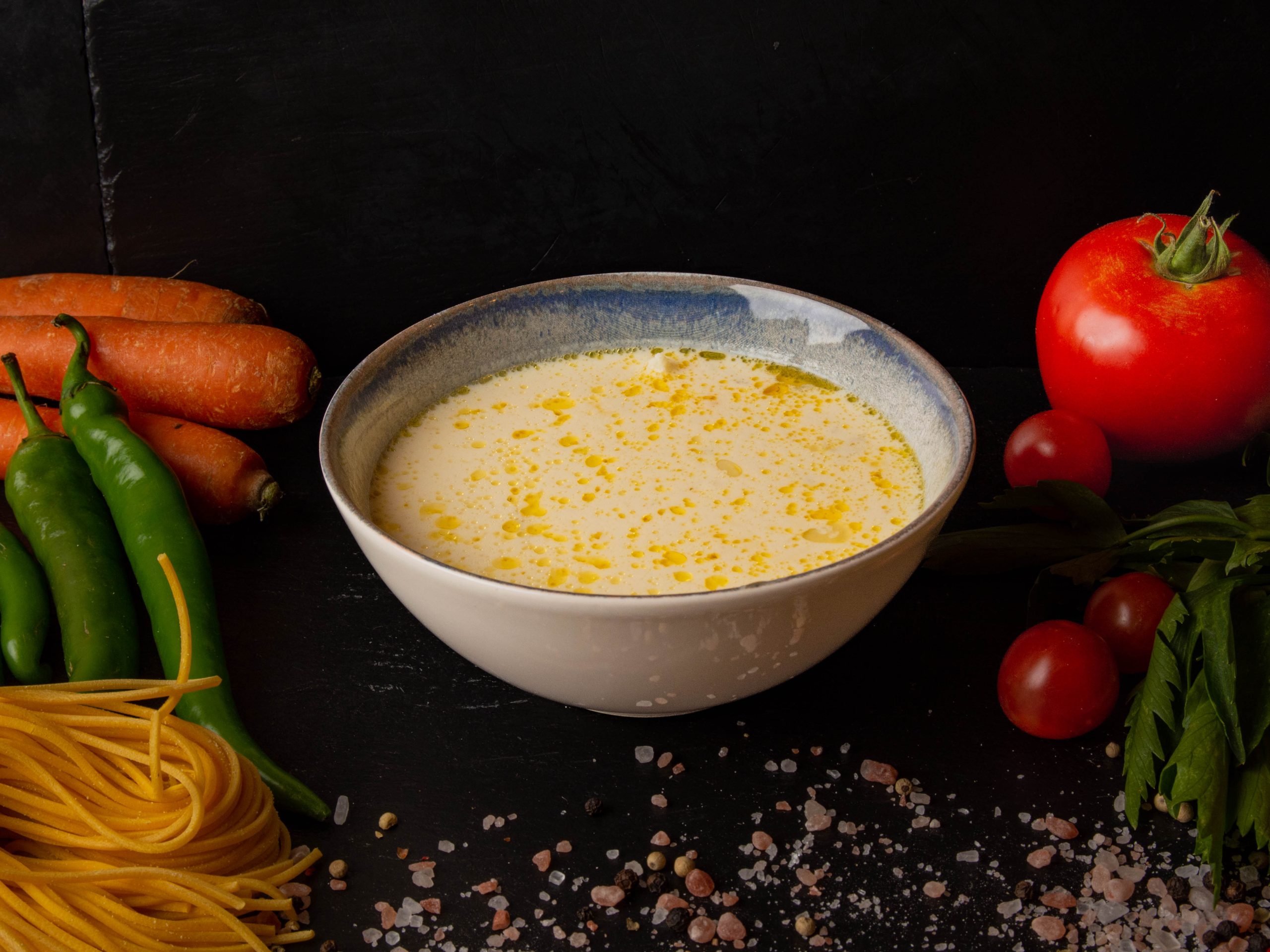 Veal tripe, sour cream, mixed spices with garlic sauce, and pickled bell peppers.